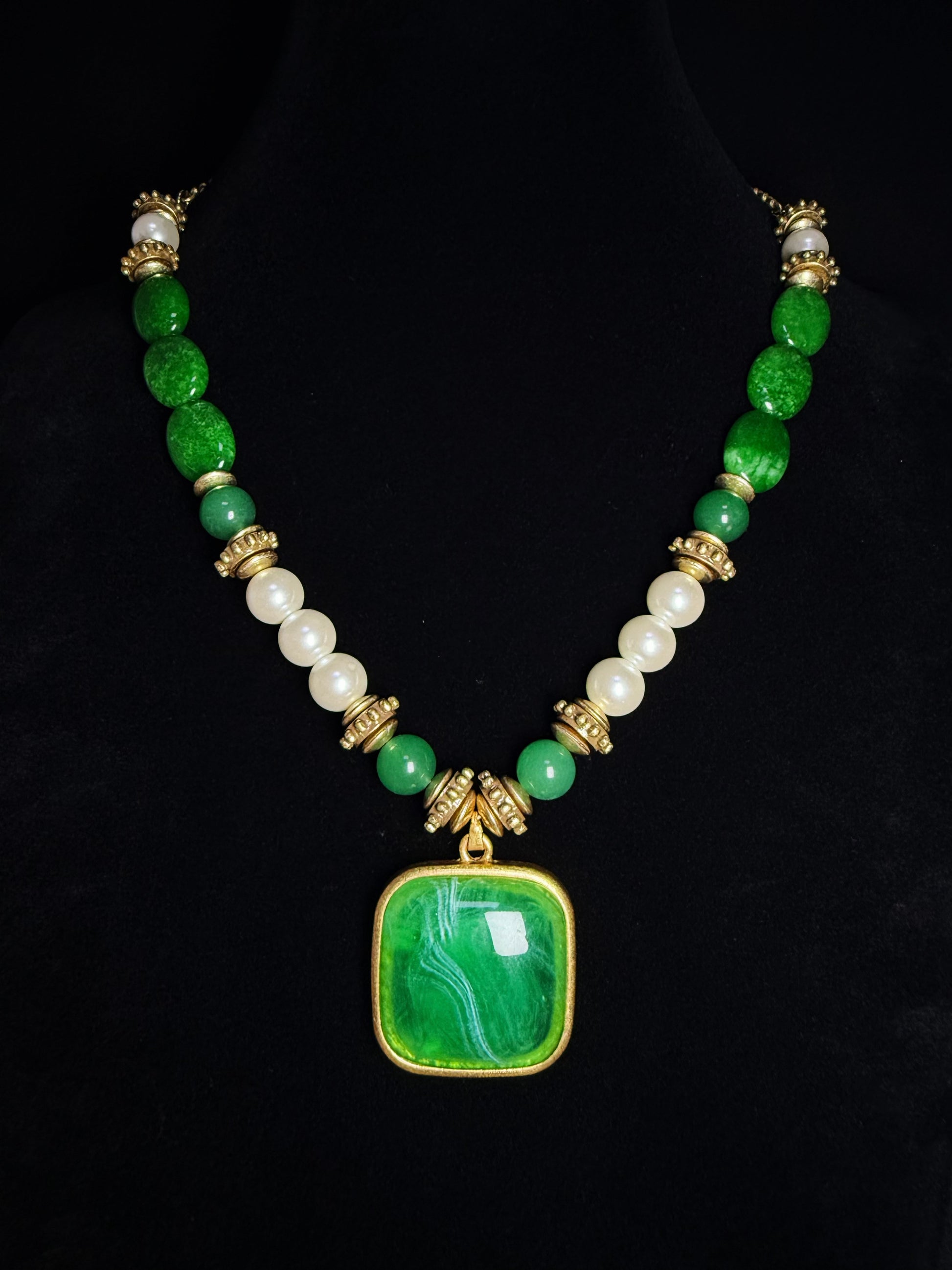 This vintage-style necklace pairs earthy green natural stones with a gold-plated square pendant, inspired by classic Swarovski elegance. The blend of organic texture and refined shine creates a timeless accessory that adds depth and sophistication to any outfit. Perfect for lovers of retro charm and unique design. #VintageNecklace #NaturalStoneJewelry #GoldPlatedPendant #SwarovskiInspired #RetroStyle #ElegantAccessories