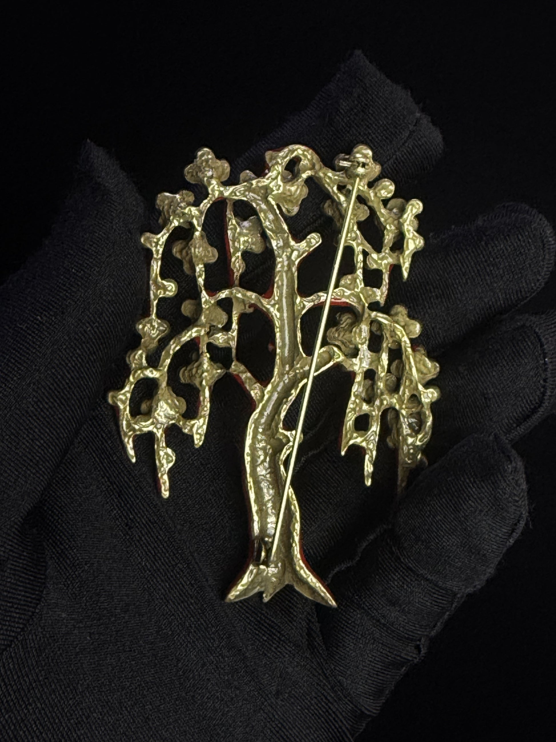 Haute Couture Enamel Tree Brooch with Czech Crystals – Gold-Plated Brass in Fiery Red