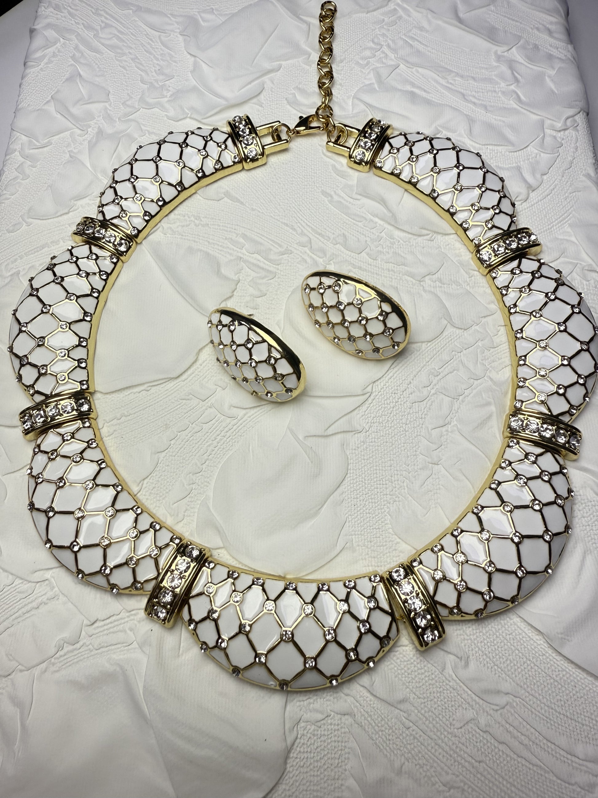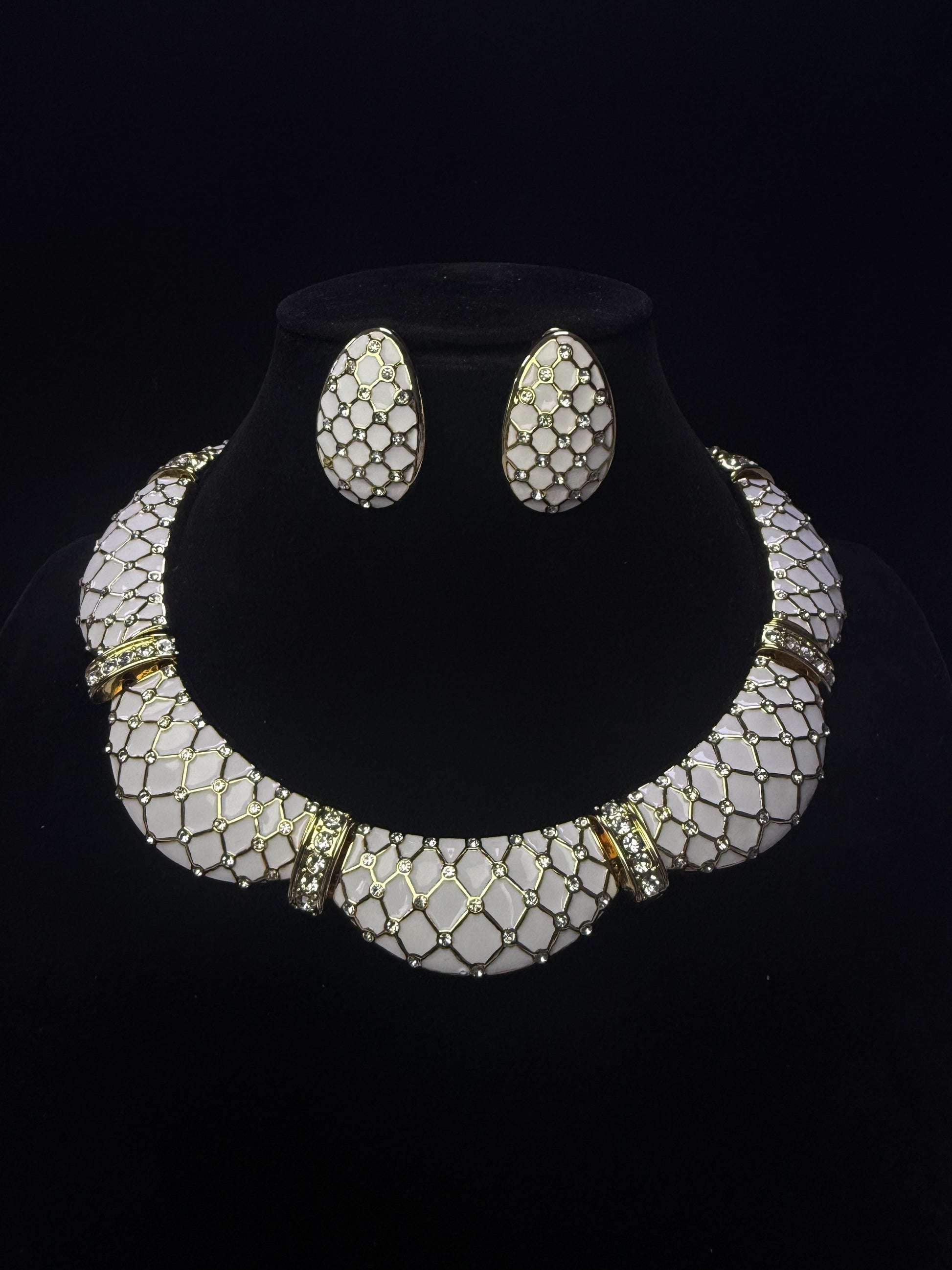 Vintage Baroque Heavy Luxury Palace Style Gold-Plated White Enamel Grid Choker & Earrings Necklace Set