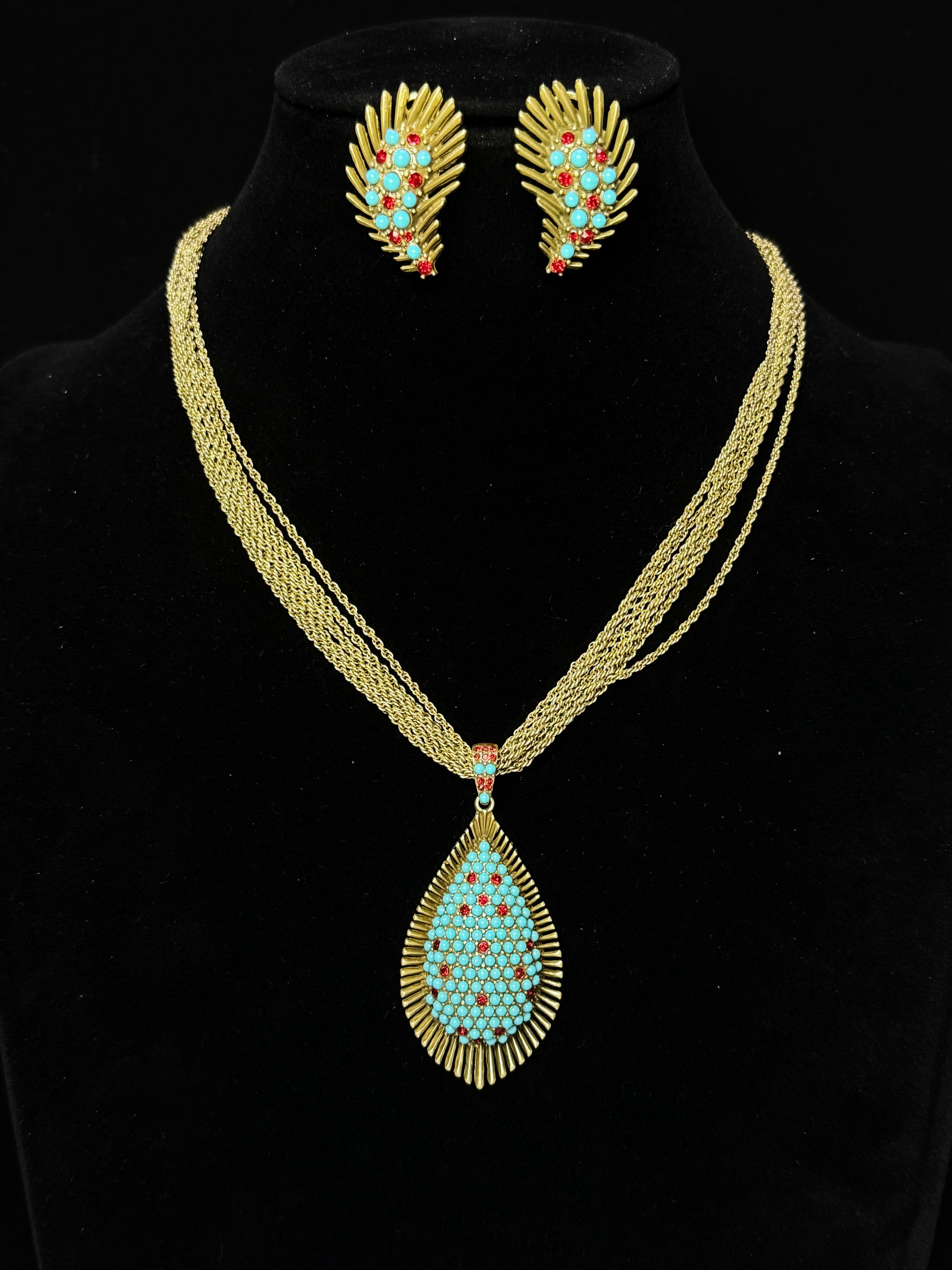 Vintage Bohemian Heavy Craft Gold-Plated Brass Full Paved Green Turquoise Leaf Earrings & Collar Necklace Set