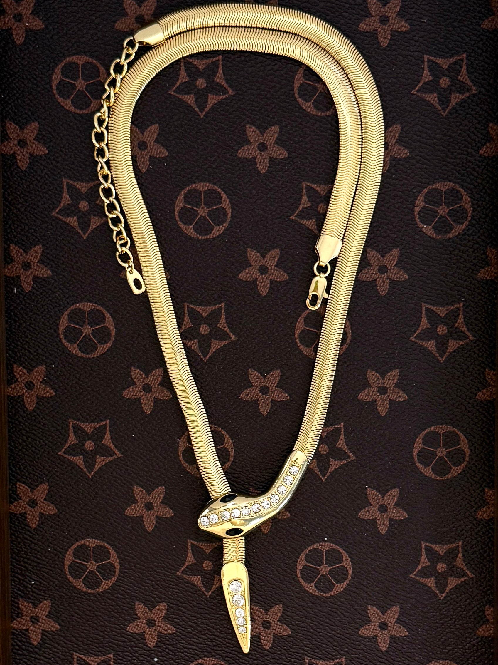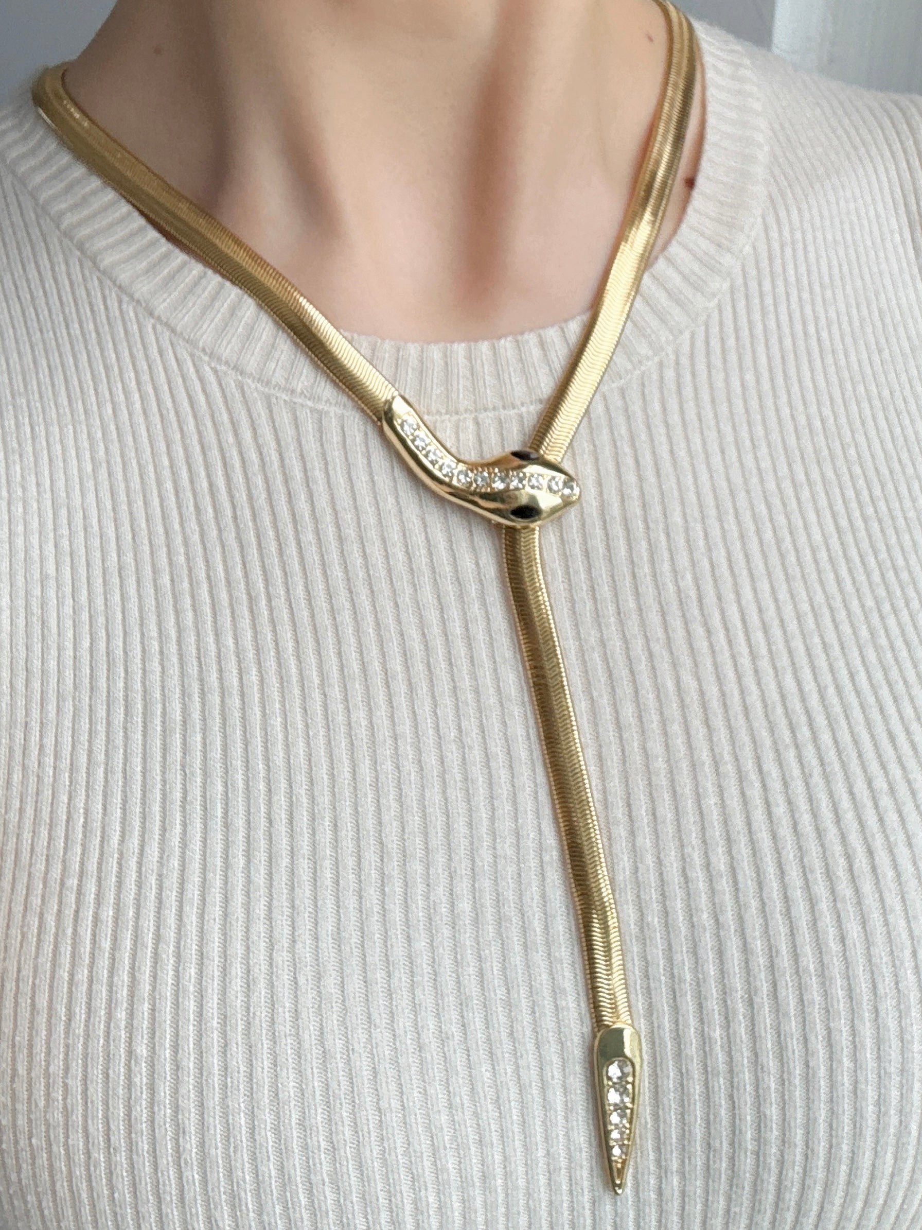 Channel timeless elegance with this vintage-inspired adjustable snake necklace, crafted in brass with a refined gold-plated finish. The sinuous serpent design symbolizes wisdom and transformation, while the subtle rhinestone details add a touch of sparkle. A perfect statement piece for layering or wearing solo. #VintageStyle #SnakeNecklace #StatementJewelry #ElegantAccessories #GoldPlatedJewelry