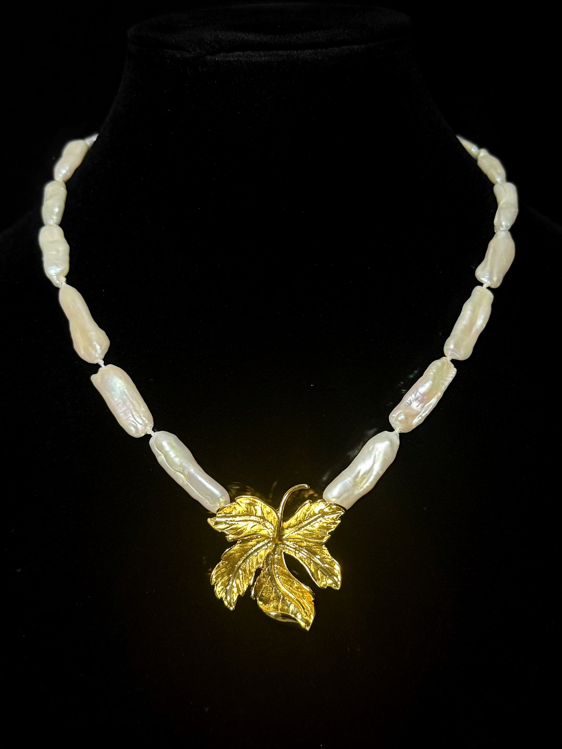 Vintage French Baroque Maple Leaf Necklace with Natural Freshwater Pearls