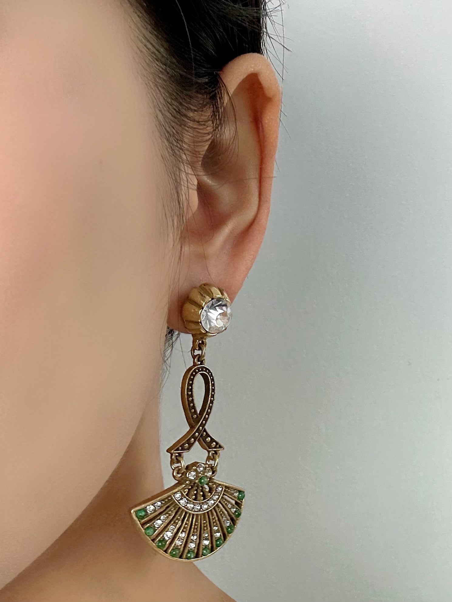 #VintageJewelry #StatementEarrings #FanEarrings #GoldPlatedBrass #RhinestoneJewelry #RetroStyle #ArtisanAccessories #VintaraStyle #UniqueEarrings #ElegantGlam