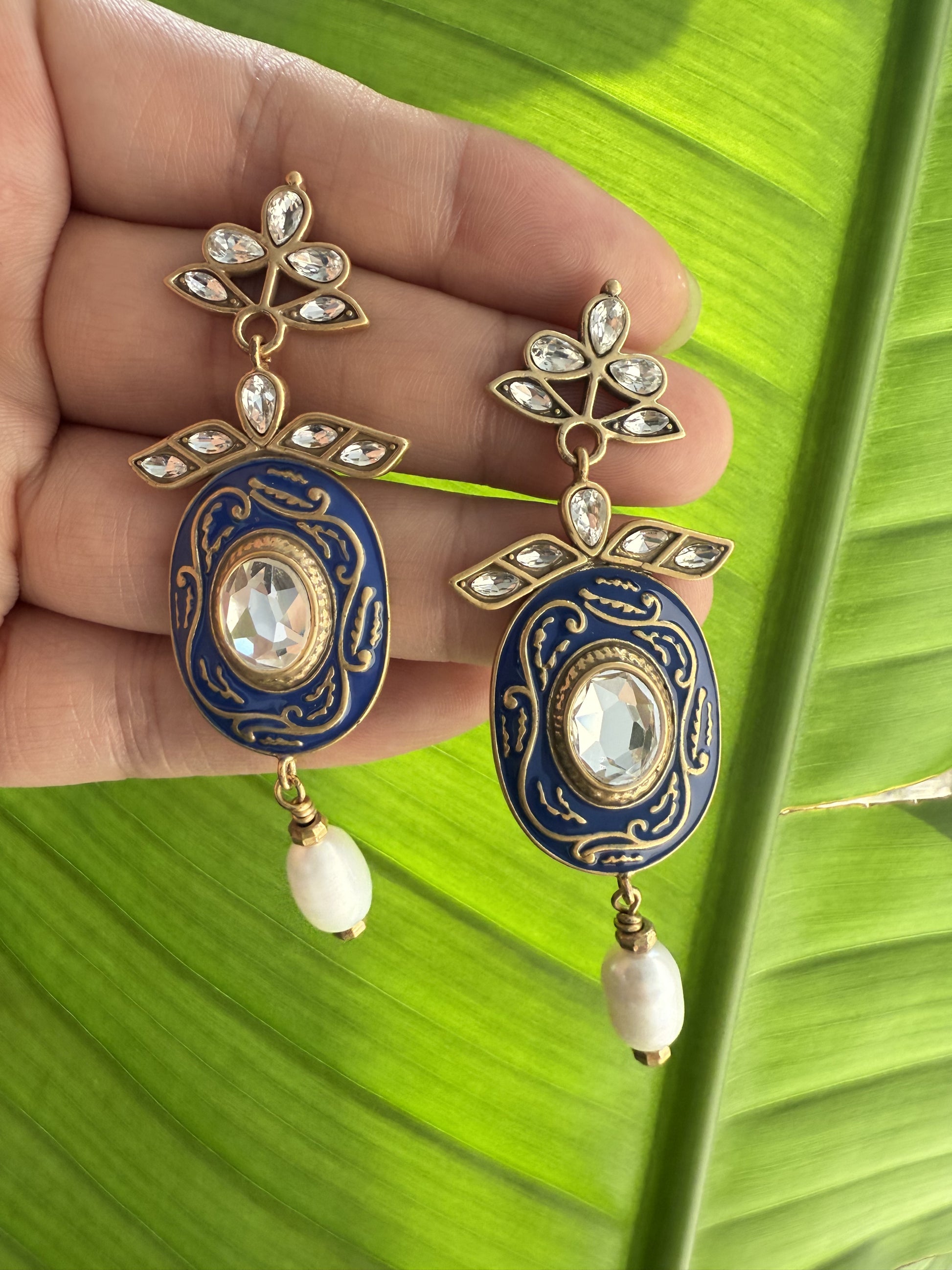 This exquisite vintage-inspired jewelry set features a pair of earrings and a matching necklace, meticulously crafted from heavy brass and plated with luxurious 18K gold. Adorned with natural baroque pearls, each piece showcases unique, organic shapes that add a touch of elegance and individuality. Delicate enamel detailing and sparkling crystal inlays enhance the design, creating a harmonious blend of classic artistry and modern sophistication. Perfect for special occasions or elevating everyday wear, this set embodies timeless beauty and refined craftsmanship, making it a treasured addition to any jewelry collection.