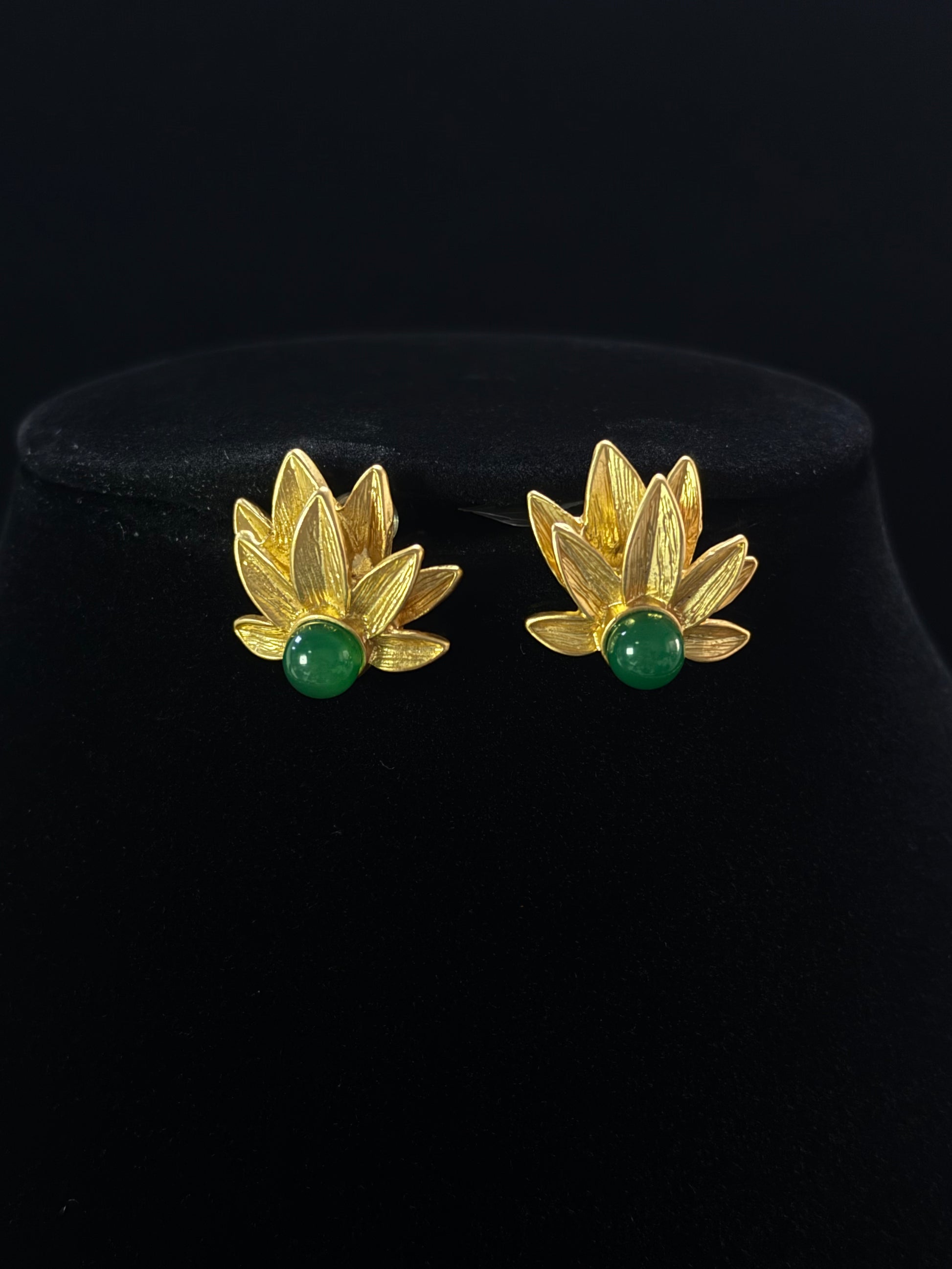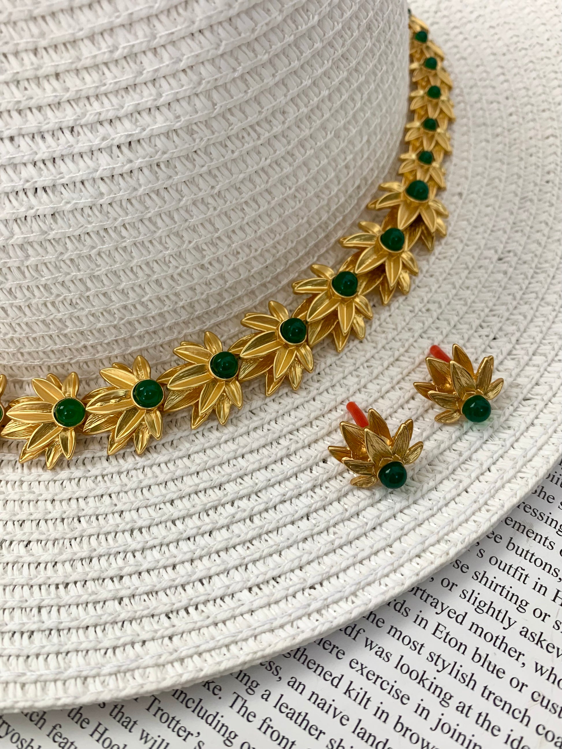 This elegant vintage jewelry set showcases a heavy craft copper base with luxurious gold plating, featuring delicate floral petal designs adorned with vibrant green chalcedony stones. The combination of warm gold tones and rich green hues creates a timeless and sophisticated look. The finely crafted earrings and matching necklace highlight classic artistry, making them perfect for vintage enthusiasts, special occasions, or as a unique gift. Designed for those who appreciate refined details and high-quality craftsmanship, this set adds a touch of nature-inspired beauty to any jewelry collection.