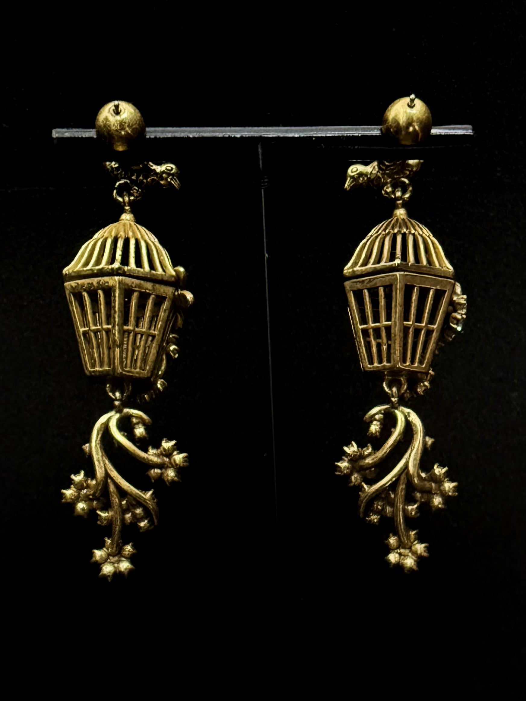 Artful and dramatic, these vintage French-inspired earrings showcase a 3D birdcage design in heavy gold-plated copper—full of story and statement. #VintageEarrings #BirdcageDesign #GoldPlatedJewelry #FrenchVintage #StatementEarrings #HeavyworkStyle #NicheDesign #ArtJewelry #RetroLuxury #SculpturalStyle
