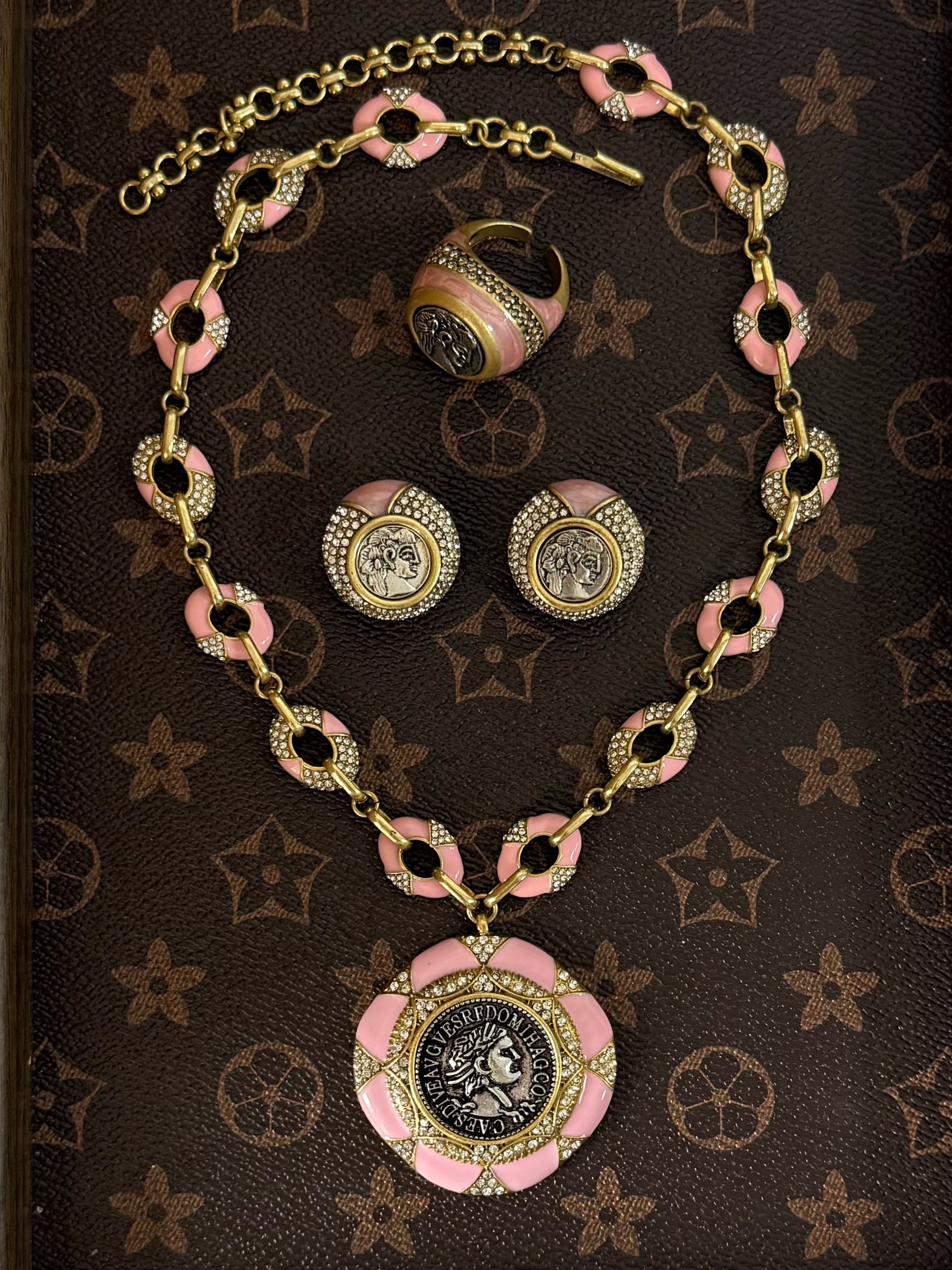 #VintageJewelry #CoinPortrait #PinkEnamel #StatementSet #GoldPlated #RetroStyle #ElegantAccessories #IndieDesign #JewelryTrio #0ziDesign