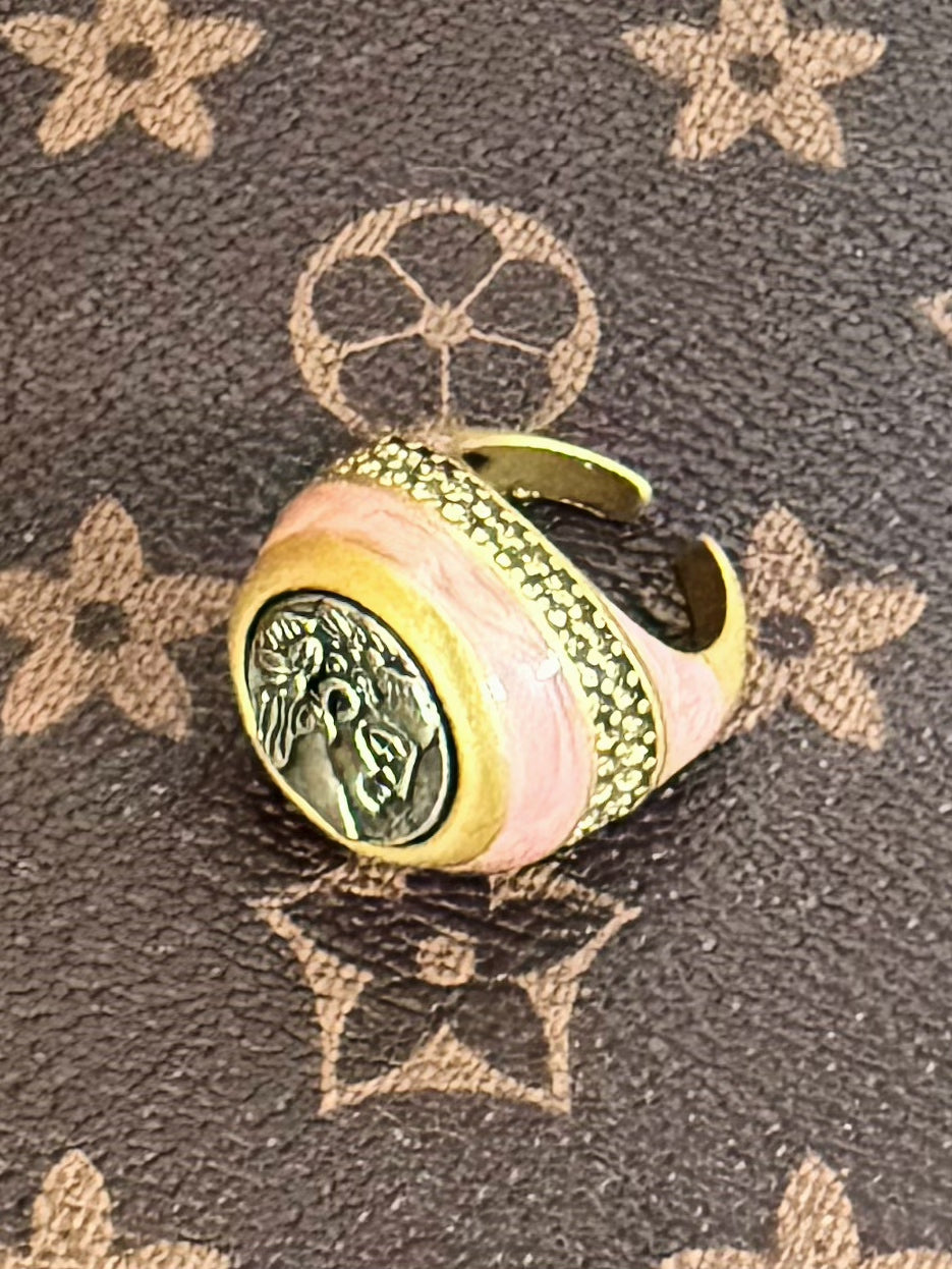 Vintage Pink Enamel Coin Portrait Jewelry Set – Gold-Plated Earrings, Ring & Necklace Trio