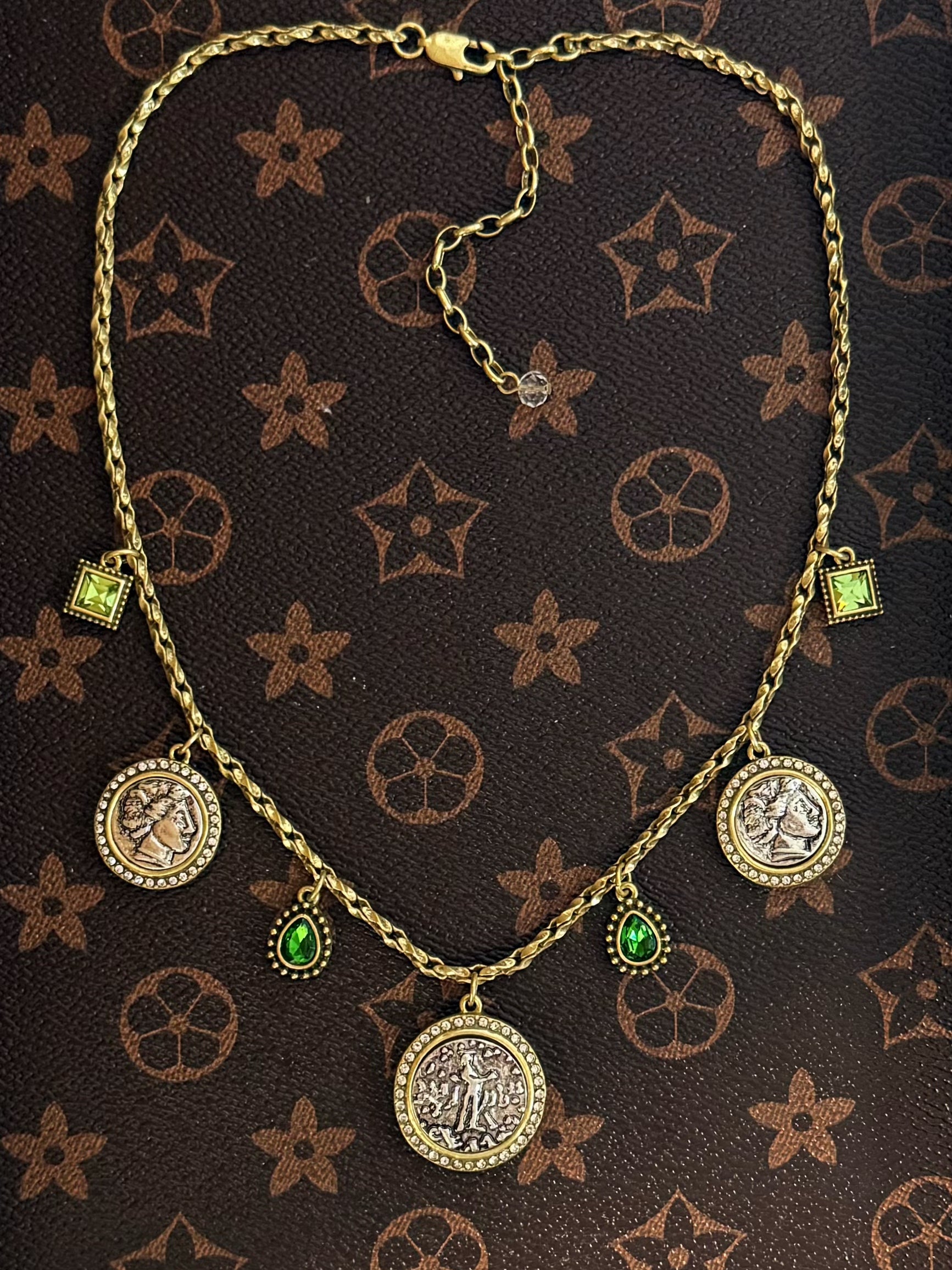 #VintageNecklace #RomanCoinJewelry #PortraitPendant #GreenRhinestone #GoldPlated #IndieDesign #RetroLuxury #StatementJewelry #ClassicalStyle #0ziDesign