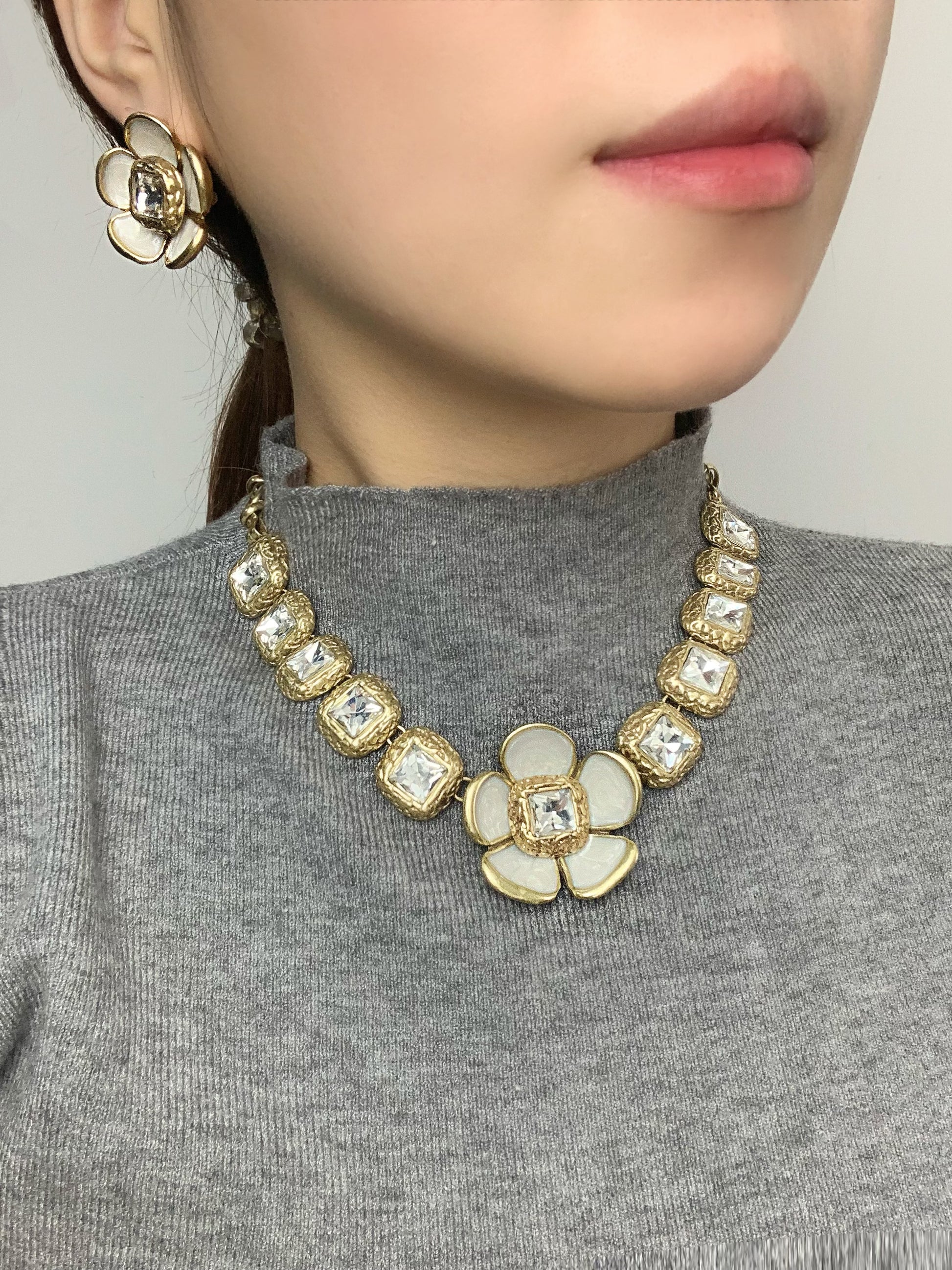 Vintage Crystal & Enamel Floral Jewelry Set - Heavy Duty Necklace & Earrings