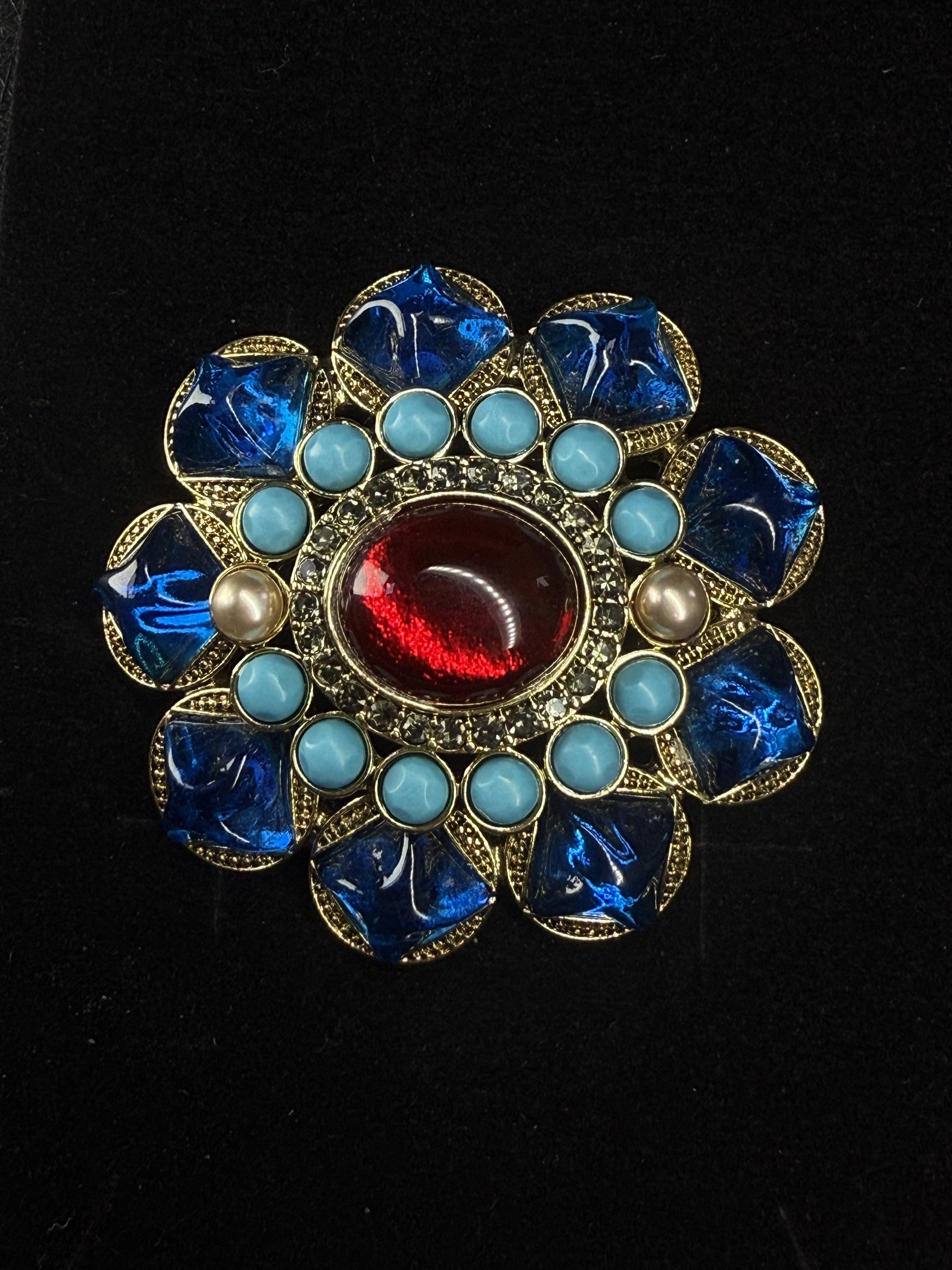 This vintage-inspired brooch combines the elegance of court-style design with a touch of luxe. Crafted from high-quality brass and plated with a rich gold finish, it features intricate detailing and a refined aesthetic. The piece is adorned with striking blue and green glass elements, along with a beautiful turquoise inlay, creating a harmonious blend of colors that evoke sophistication and timeless beauty. Ideal for those who appreciate refined, luxurious accessories, this brooch is perfect for elevating any outfit, whether worn at special events or as a standout piece in your everyday jewelry collection.